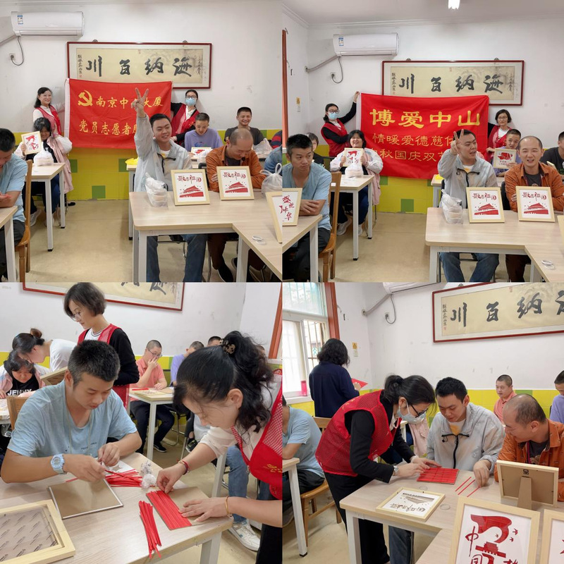 活動中,中山大廈給在場的特殊兒童分發(fā)了月餅,并一起制作手工竹編畫,竹編手工藝體驗,是一項充滿趣味的活動,親自動手感受、緩慢勞作的手工制作形式顯得尤為珍貴。活動開始前,工作人員向他們詳細講解竹編工藝的歷史、制作流程以及主要特點。在對竹編工藝有了一定了解后,在老師們的帶領(lǐng)下開始了竹編畫的制作。經(jīng)過“壓一挑一”的編織及逐排調(diào)整定型,形成一塊方正的竹編板,之后將各種愛國主題圖案的板卡用雙面膠固定在編制好的竹編板上并裝入相框,最終完成一幅幅精美的非遺竹編畫。以傳統(tǒng)竹編技藝呈現(xiàn)出不同圖案的愛國主題畫面,紛紛沉浸在非遺竹編文化的魅力中。