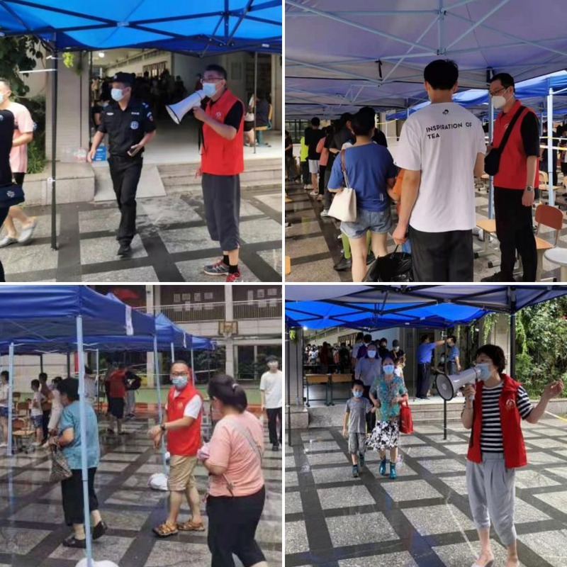 在商場黨支部支委班子的帶領(lǐng)下,先鋒隊員們經(jīng)過完善的培訓(xùn)后,馬上投入到維護現(xiàn)場秩序、引導(dǎo)應(yīng)檢人員入場、為老弱病殘人員開通綠色通道等工作當中。由于北門橋社區(qū)地屬城市中心地帶,應(yīng)檢人員眾多,經(jīng)合理安排后,馬忱靚在入口處協(xié)同疏放工作、姚雷指引應(yīng)檢人員進入排隊通道、其余人員分列在各應(yīng)檢通道作人流引導(dǎo)入列工作并維護現(xiàn)場秩序?,F(xiàn)場不時有老弱病殘等特殊人群應(yīng)檢,郎天榮領(lǐng)各通道隊員配合協(xié)助其準備應(yīng)檢二維碼后,安排出綠色通道優(yōu)先檢測。在淅瀝的風(fēng)雨聲中,伴隨著志愿者們有序的指引口號,長長的隊伍有條不紊地進入醫(yī)護工作人員就檢行列。有老兩口相攜進入的、有父母抱著小寶寶進入的、有八九十歲老人拄著拐杖進入的、有保姆推著輪椅進入的......直到深夜才基本全部檢測完畢。有困難找“紅馬甲”、有問題問“紅馬甲”,在他們的眼中我們這群“紅馬甲”有一個共同的名字——“中山大廈志愿者”。